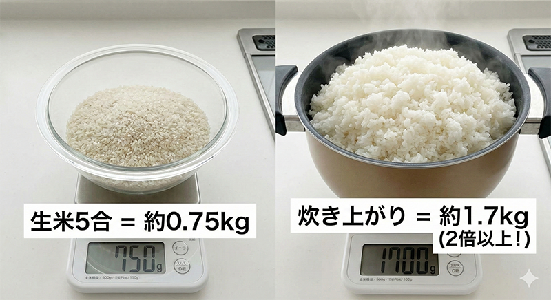 ただし、これはあくまで「炊く前の生米」の重さ。水を吸わせて炊き上がった後のごはんは、重さが2倍以上に増えます。ここを計算に入れておかないと、「鍋に入りきらない!」「重すぎて運べない」といった失敗につながりかねません。