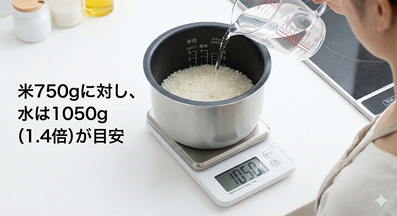 水は「1cc = 1g」と考えて問題ありません。キッチンスケールの上に炊飯釜を置き、米750gを入れた状態でリセット(0表示)し、そこから水を約1000g~1050g注げば完璧です。