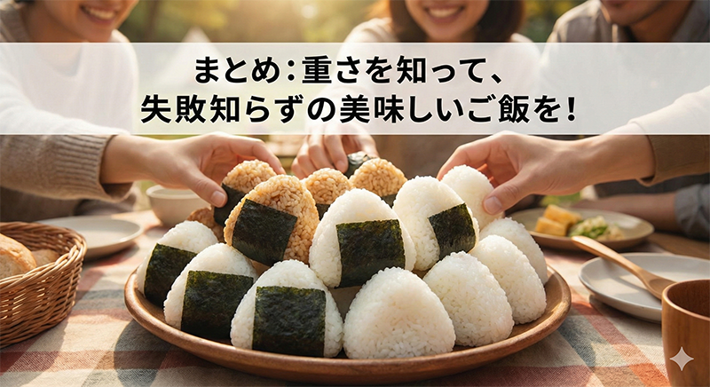 ぜひ、今夜のご飯や次のイベントで、この「重さの知識」を活用して美味しいご飯を炊いてくださいね。