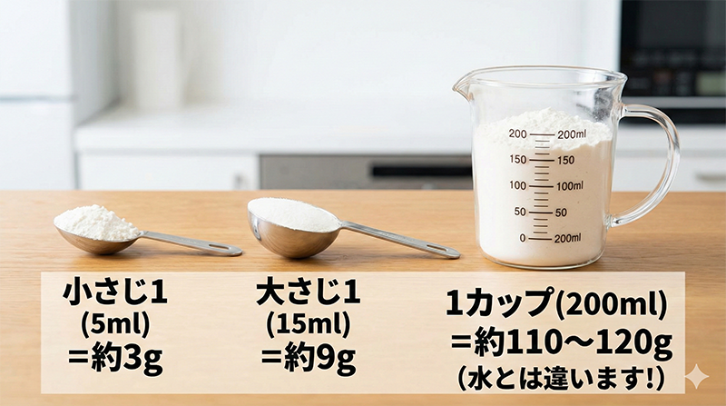 この記事では、正確なグラム換算の早見表に加え、計量スプーンや秤がない場合の代用テクニック、そして小麦粉との決定的な違いまで、分かりやすく解説します。