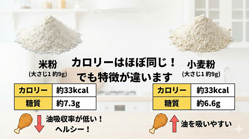 単なる粉のカロリーだけでなく「調理後のヘルシーさ」まで考えると、揚げ物料理においては米粉に軍配が上がると言えるでしょう。