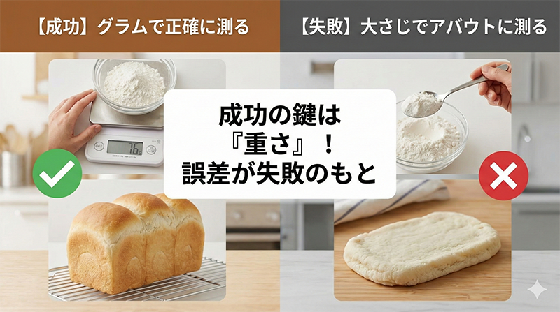 たかが数グラムと思うかもしれませんが、パン作りやお菓子作りにおいてはこの誤差が「膨らまない」「べちゃつく」といった失敗の直接的な原因になります。