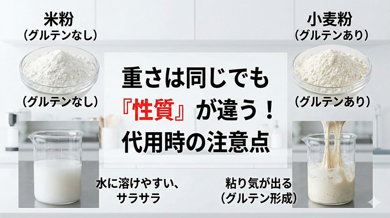 最後に、よくある疑問「小麦粉の代わりに米粉を使ってもいいの?」について解説します。