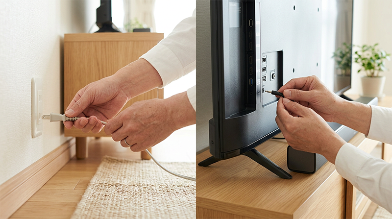 これだけです。Bluetoothの設定も、Wi-Fiのパスワード入力も一切不要。 一度繋いでしまえば、あとは普段どおりテレビのリモコンで電源を入れるだけで連動して起動します。