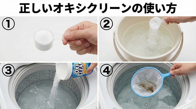 - オキシクリーンを事前にしっかり溶かしてから投入する。