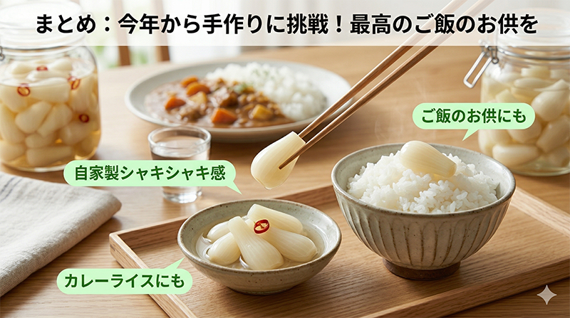 この3つのポイントさえ守れば、初めての方でも絶対に美味しいらっきょう漬けが完成します。カレーのお供にはもちろん、お酒のおつまみや、刻んでタルタルソースに混ぜるのも絶品です。